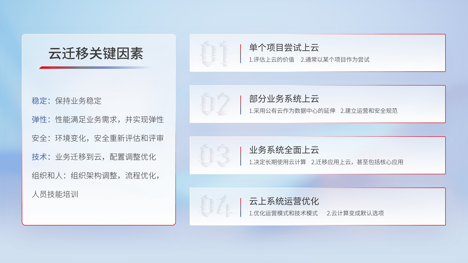 结合实际业务,,,从规划设计、、云平台选型、、、云原生改造、、数据迁移、、、、集成交付,,,,迁移全过程为客户识别最佳上云路径,,,做好风险识别管理,,,,设计网络架构、、、、身份权限、、安全审计合规、、、操作审计、、、、日志审计、、、、监控告警策略、、多站点容灾设计等,,,,对云上基础设施进行整体规划,,,提升IT治理水平,,,,以满足弹性、、高可用、、、、高性能的需求。。。
